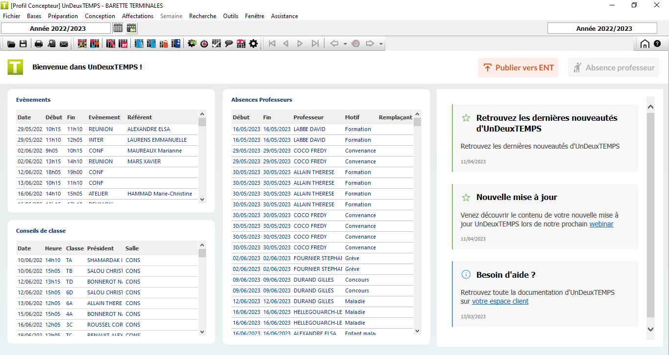 UnDeuxTEMPS évolue régulièrement pour proposer aux établissements une expérience utilisateur en accord avec leurs pratiques et surtout en phase avec les actualités du monde de l'éducation. C'est le cas avec la réforme des lycées, le logiciel est en mesure de gérer les parcours de spécialités de chaque élève ; ou plus récemment avec le pacte RCD afin de répondre à « un enseignant devant chaque élève » .